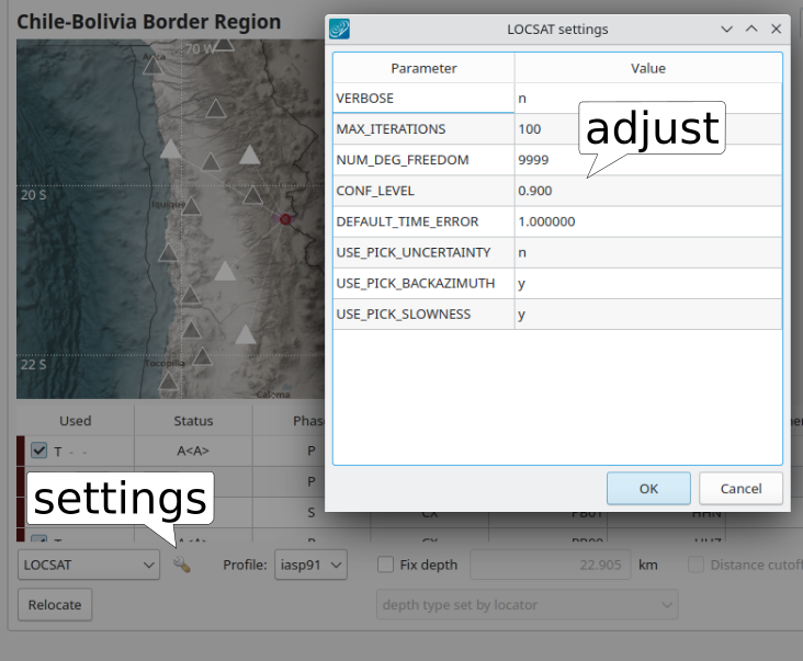 When using LOCSAT in scolv you may interactively some settings. The changes only apply during runtime.
